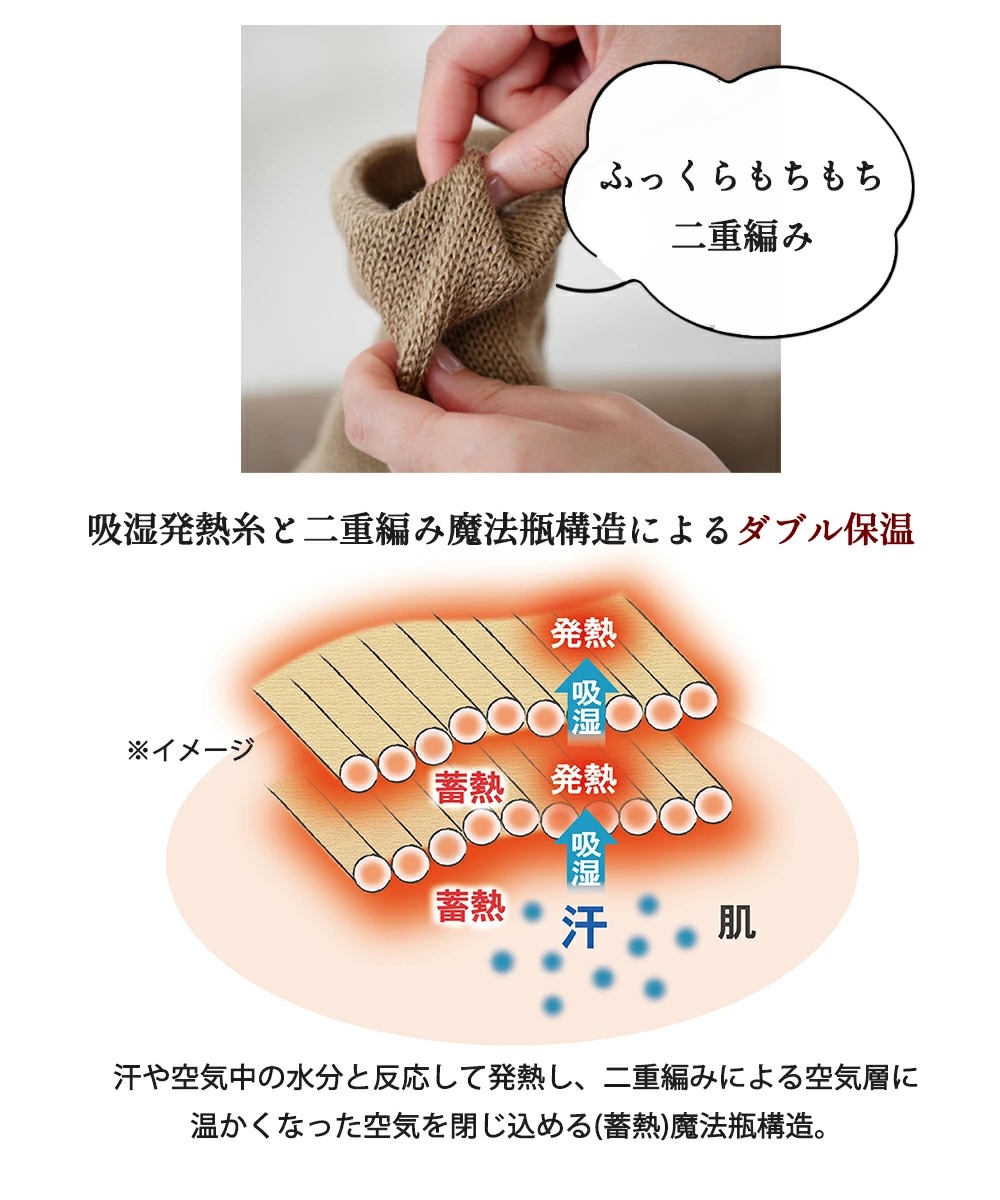 表地と裏地の間に空気層を作る二重編み構造を採用。体温で温められた空気をこの層に閉じ込め、まるで魔法瓶のように保温します。発熱した温かさを外に逃さず、冷たい外気をシャットアウトします。