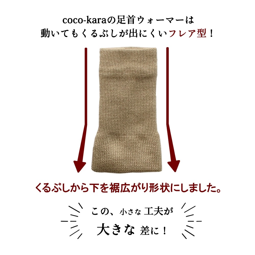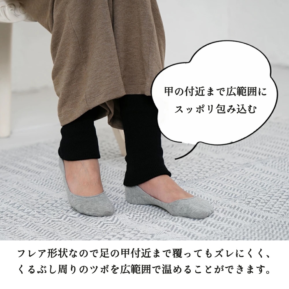 冷えのツボが集まるとされるくるぶし周りを、一般的な足首ウォーマーよりも広く深くカバーします。裾に向かってゆるやかに広がるフレア型なので、足首に密着しながらも締め付けすぎず、着用時のストレスを軽減します。