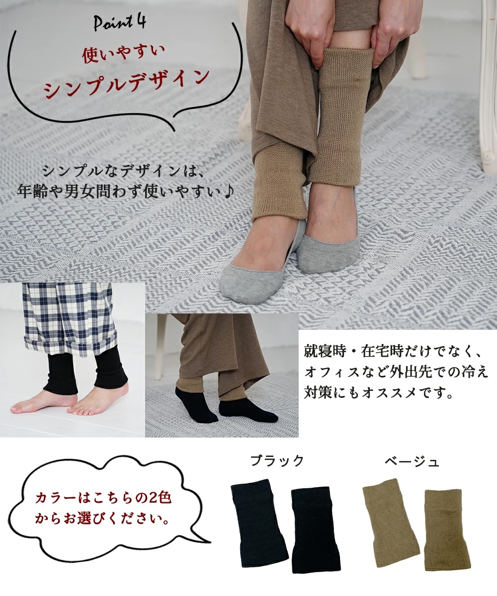 冷えが気になる時や、オフィスでのデスクワーク時、夜の就寝時など、長時間着用する際におすすめです。靴下やタイツの上からでも着用可能です。